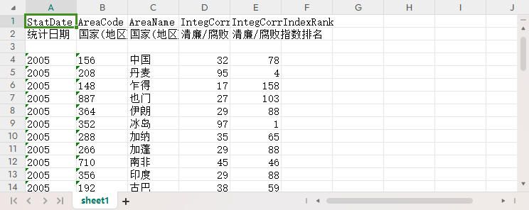 统计日期 国家(地区)代码 国家(地区)名称 清廉/腐败指数 清廉/腐败指数排名