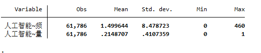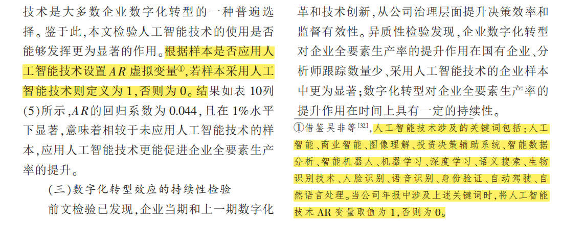 人工智能技术涉及的关键词包括:人工智能、商业智能、图像理解、投资决策辅助系统、智能数据分析、智能机器人、机器学习、深度学习、语义搜索、生物识别技术、人脸识别、语音识别、身份验证、自动驾驶、自然语言处理。当公司年报中涉及上述关键词时,将人工智能技术 AR 变量取值为 1,否则为 0