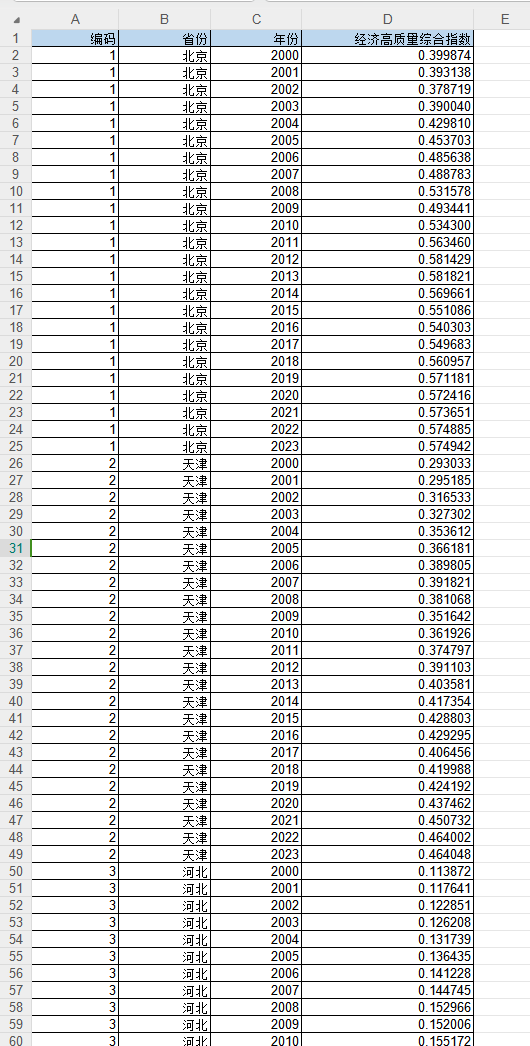 经济高质量发展的核心在于转变经济增长模式,从数量型转向质量型,强调创新驱动、绿色发展和民生改善。以下是部分省份2000年至2023年的经济高质量发展数据概览: