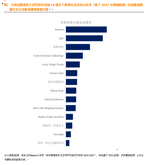 根据QYResearch头部企业研究中心调研,全球范围内高精度电子皮带秤生产商主要包括Siemens、Qlar、赛摩智能、Control Systems Technology、Avery Weigh-Tronix、Yamato Scale、徐州圣能科技、Thayer Scale、Merrick Industries、Rice Lake Weighing Systems等。2023年,全球前五大厂商占有大约56.00%的市场份额,全球前十强厂商占有大约75.00%的市场份额。