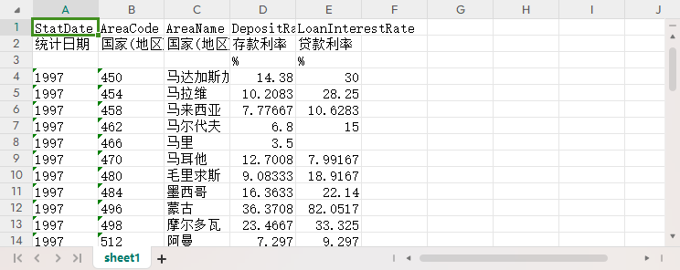 统计日期 国家(地区)代码 国家(地区)名称 存款利率 贷款利率