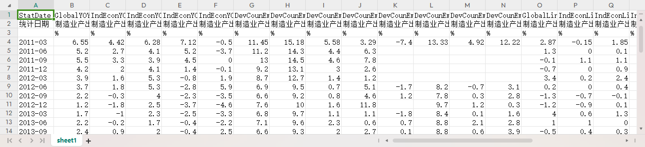 统计日期        制造业产出同比增速估计-全球        制造业产出同比增速估计-工业化经济体        制造业产出同比增速估计-工业化经济体-北美        制造业产出同比增速估计-工业化经济体-欧洲        制造业产出同比增速估计-工业化经济体-东亚        制造业产出同比增速估计-发展中国家与新兴工业经济体        制造业产出同比增速估计-发展中国家与新兴工业经济体-按发展程度-中国        制造业产出同比增速估计-发展中国家与新兴工业经济体-按发展程度-新兴工业经济体        制造业产出同比增速估计-发展中国家与新兴工业经济体-按发展程度-其它发展中国家        制造业产出同比增速估计-发展中国家与新兴工业经济体-按地域-非洲        制造业产出同比增速估计-发展中国家与新兴工业经济体-按地域-亚太        制造业产出同比增速估计-发展中国家与新兴工业经济体-按地域-拉美        制造业产出同比增速估计-发展中国家与新兴工业经济体-按地域-其它        制造业产出环比增速估计-全球        制造业产出环比增速估计-工业化经济体        制造业产出环比增速估计-工业化经济体-北美        制造业产出环比增速估计-工业化经济体-欧洲        制造业产出环比增速估计-工业化经济体-东亚        制造业产出环比增速估计-发展中国家与新兴工业经济体        制造业产出环比增速估计-发展中国家与新兴工业经济体-按发展程度-中国        制造业产出环比增速估计-发展中国家与新兴工业经济体-按发展程度-新兴工业经济体        制造业产出环比增速估计-发展中国家与新兴工业经济体-按发展程度-其它发展中国家        制造业产出环比增速估计-发展中国家与新兴工业经济体-按地域-非洲        制造业产出环比增速估计-发展中国家与新兴工业经济体-按地域-亚太        制造业产出环比增速估计-发展中国家与新兴工业经济体-按地域-拉美        制造业产出环比增速估计-发展中国家与新兴工业经济体-按地域-其它