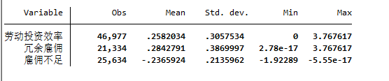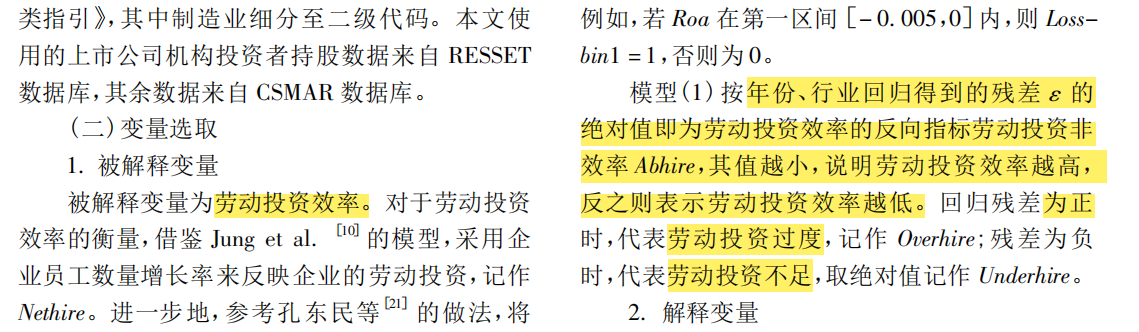用企业的雇佣员工数量变动百分比来衡量企业的净雇佣量,然后按照雇佣员工变动率对其他几个相关的经济变量在固定行业效应后进行回归。回归后得到非正常劳动投资效率的序列