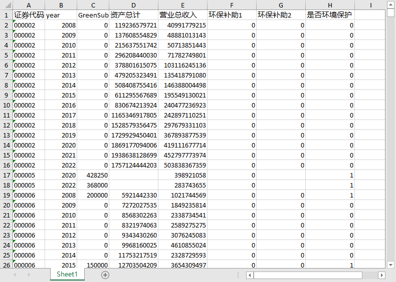 相关数据:证券代码、年份、绿色补贴、资产总计、营业总收入、环保补助1、环保补助2、是否环境保护。