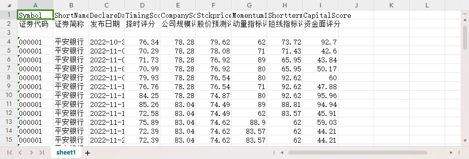 证券代码 证券简称 发布日期 择时评分 公司规模评分 股价预测评分 动量指标评分 短线指标评分 资金面评分