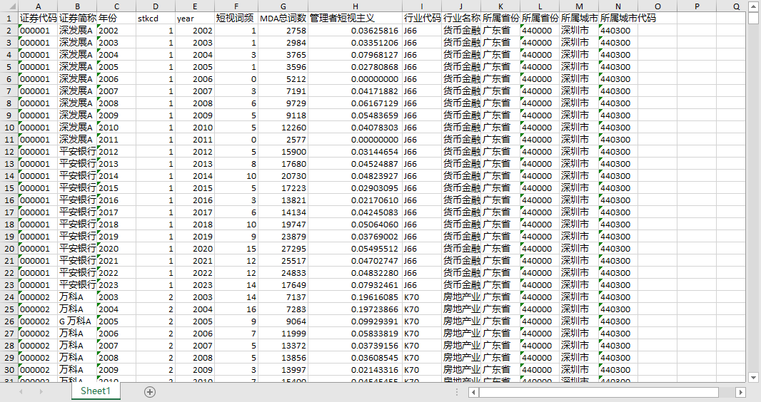 证券代码 证券简称 年份 stkcd year 短视词频 MDA总词数 管理者短视主义 行业代码 行业名称 所属省份 所属省份代码 所属城市 所属城市代码