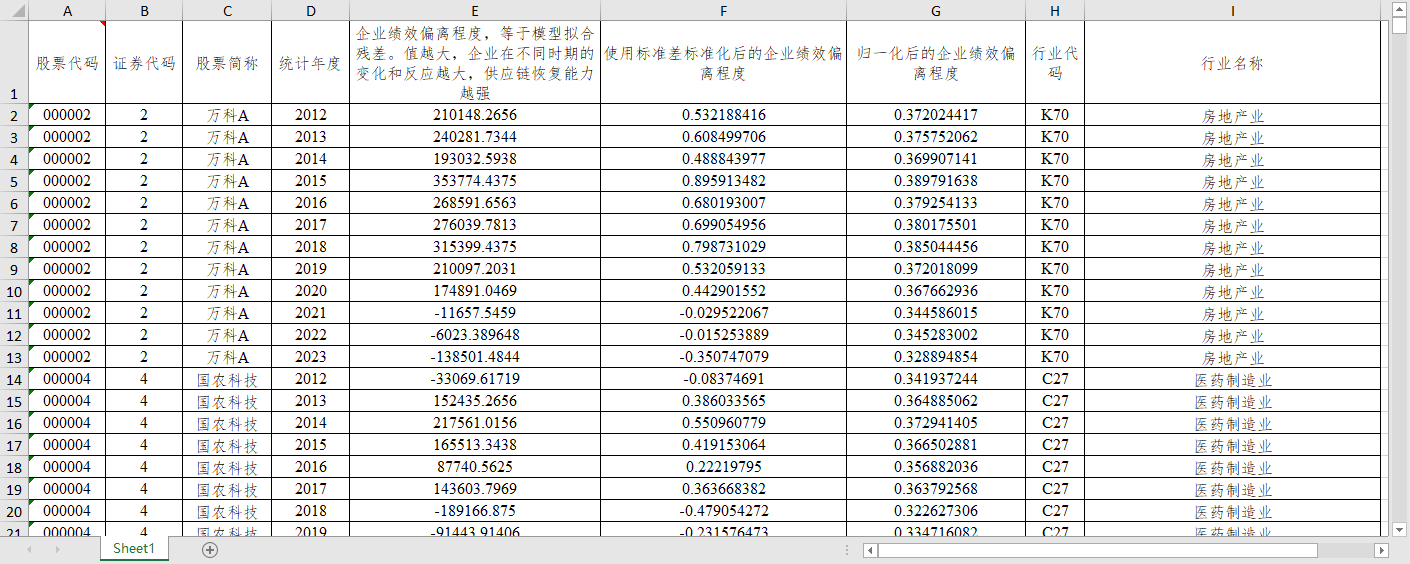 上市公司企业供应链恢复力数据2023-2012企业绩效偏离程度模型拟合残差行业名称