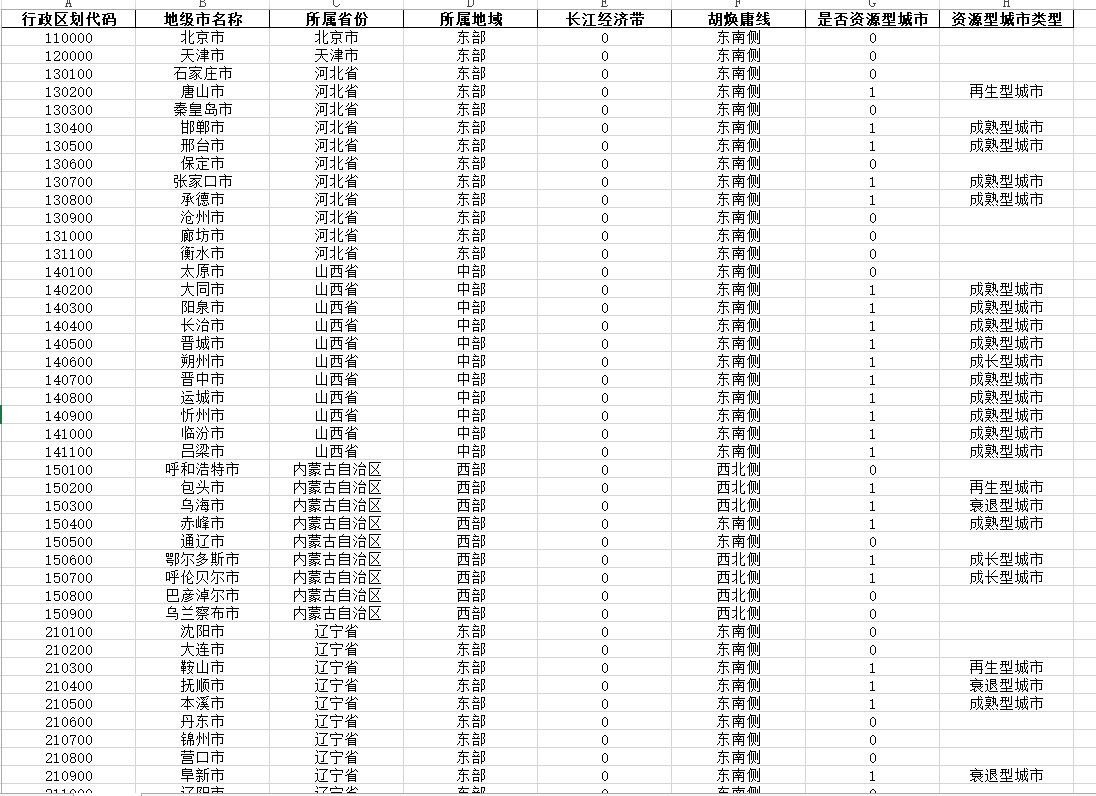 本数据来源于《全国资源型城市可持续发展规划(2013-2020年)》,覆盖了全国300个地级以上城市,共包含300条数据样本。包含资源型城市的名单、胡焕庸线、长江经济带、地域划分等多个维度,为深入分析资源型城市的分布特征、发展态势等提供了丰富的信息。