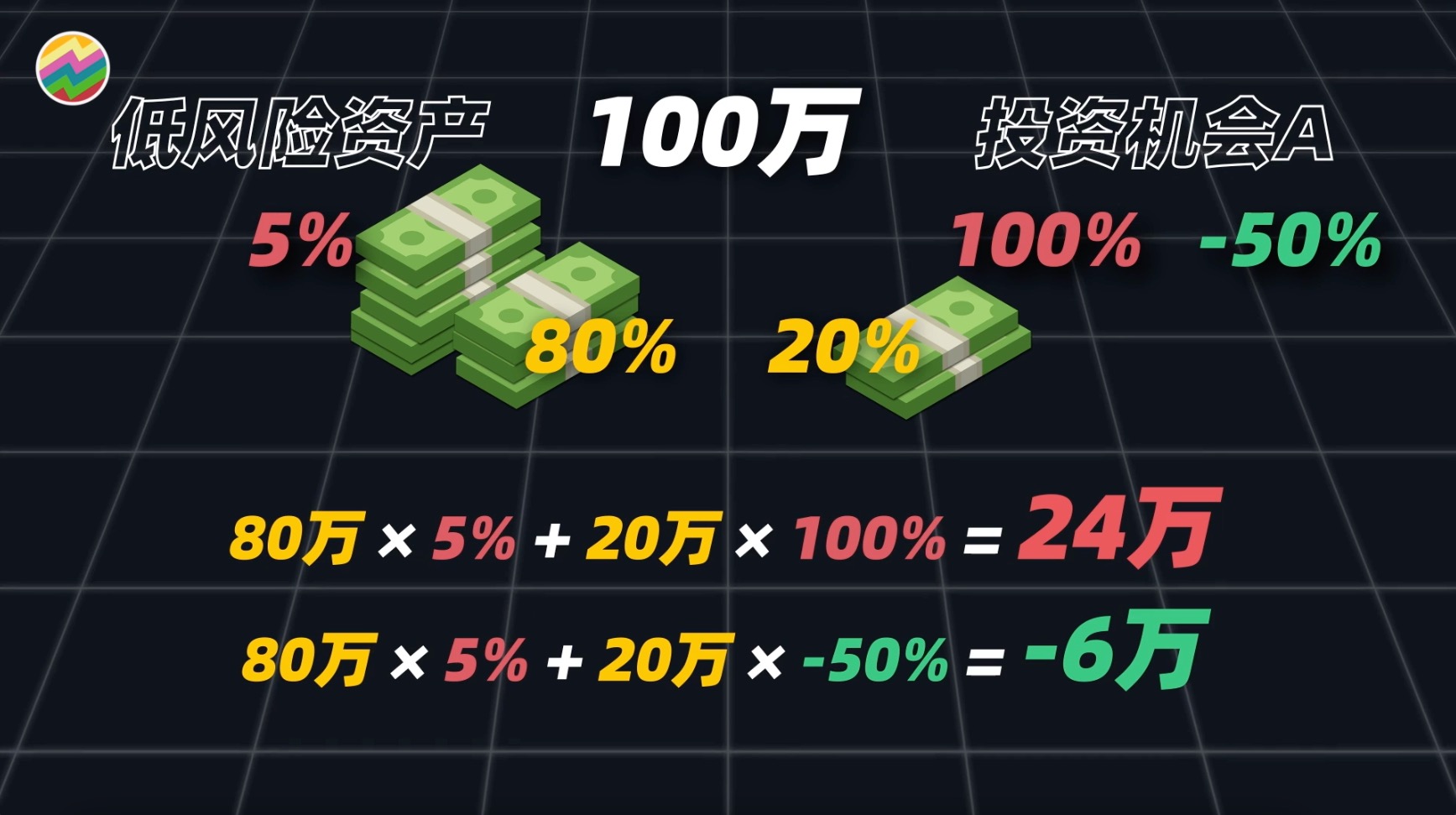如果用10%的资金交易A,余下90%资金仍持有低风险资产,每年投资收益期望即变为赚14.5万或亏0.5万。