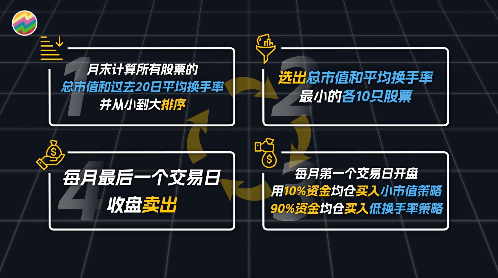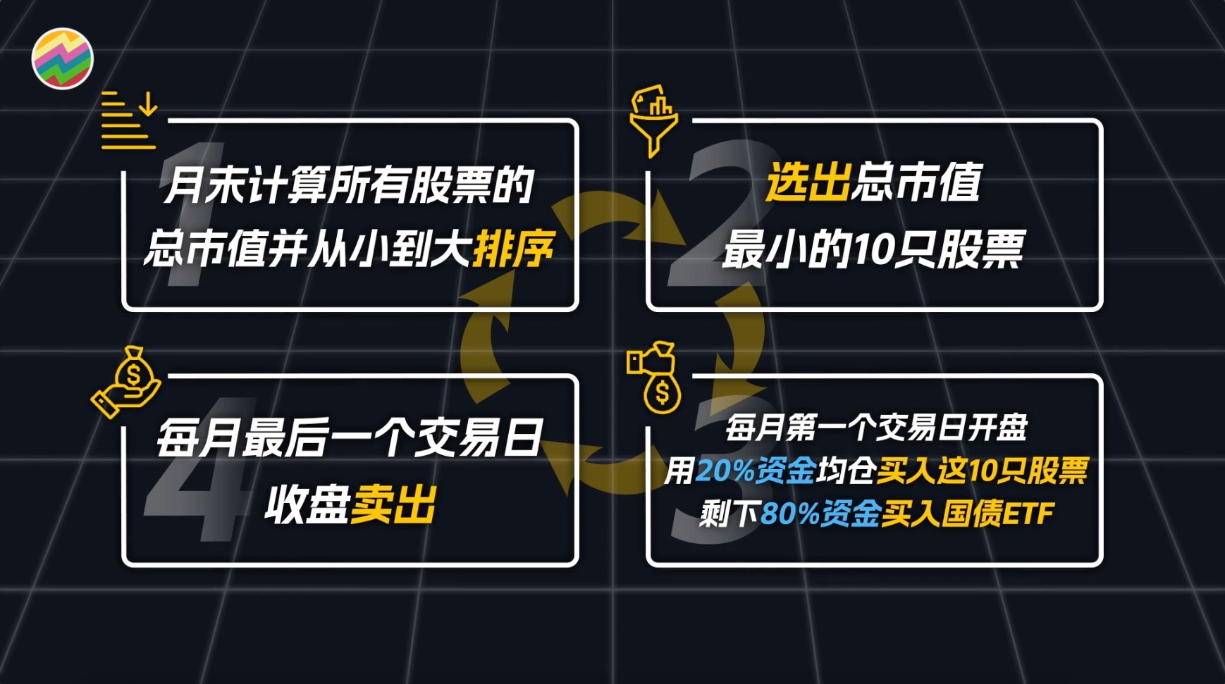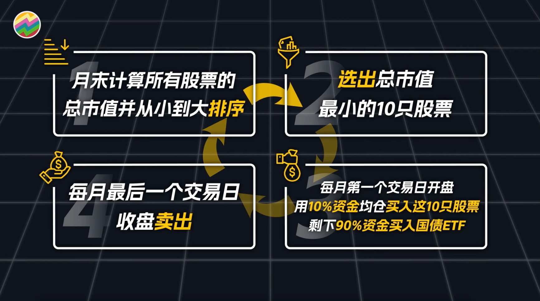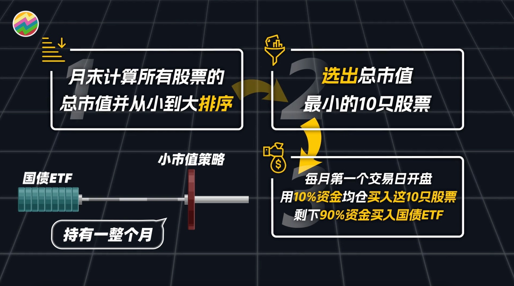 选择此时市值最小的10只股票,在下个月的第一个交易日开盘,用10%的资金去均仓买入它们,剩余资金则买入国债ETF,一直持有到下个月