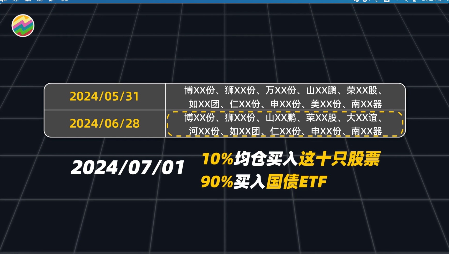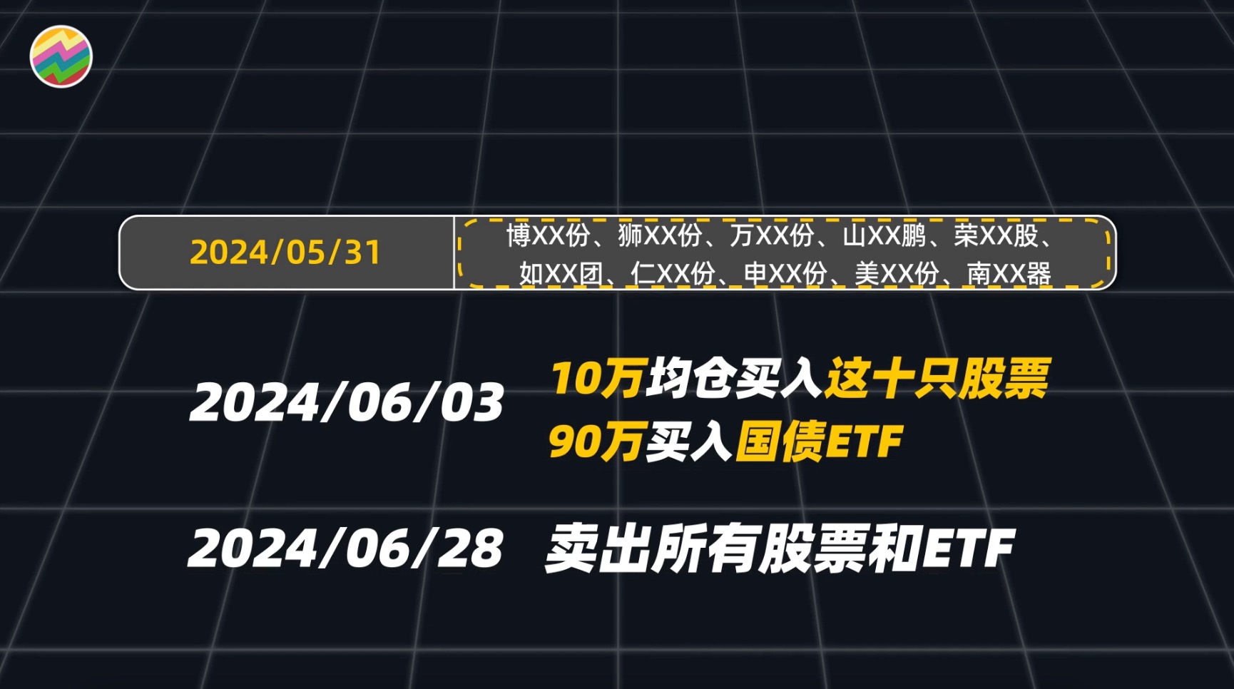 例如在2024年5月31日当天,选择此时总市值最小的10只股票,在6月3日开盘用10%的资金均仓买入它们,剩余资金买入国债ETF,持有至6月28日收盘清仓,并重新选股。