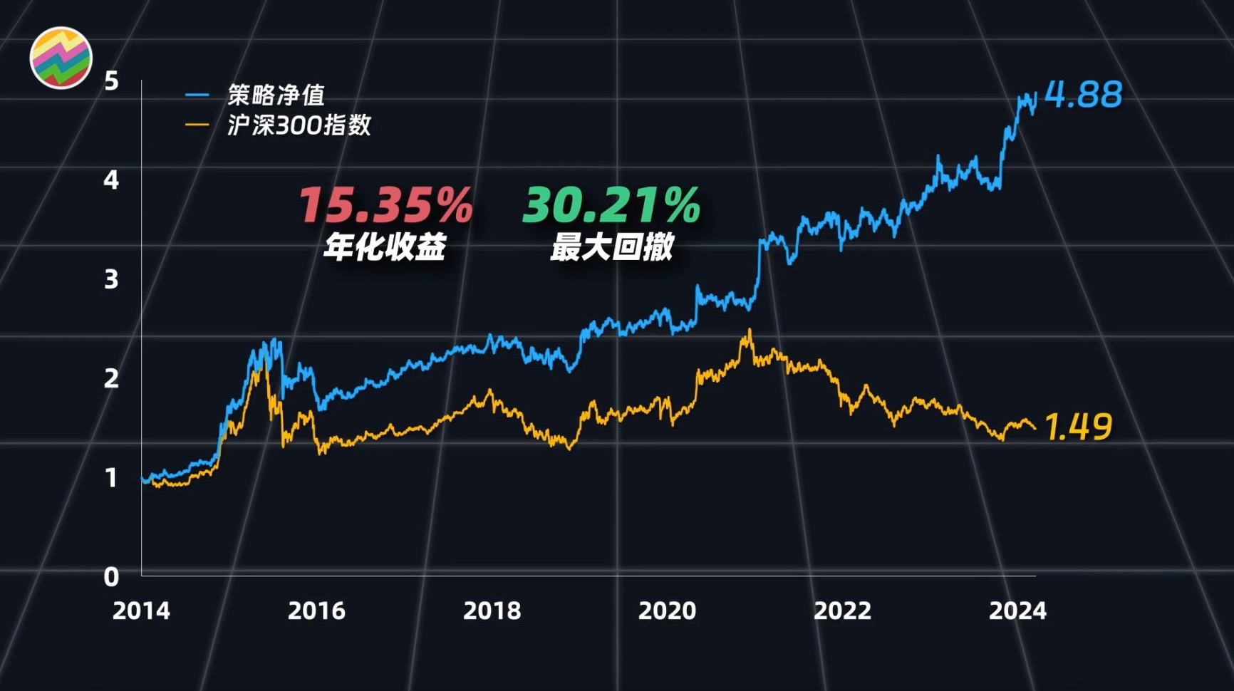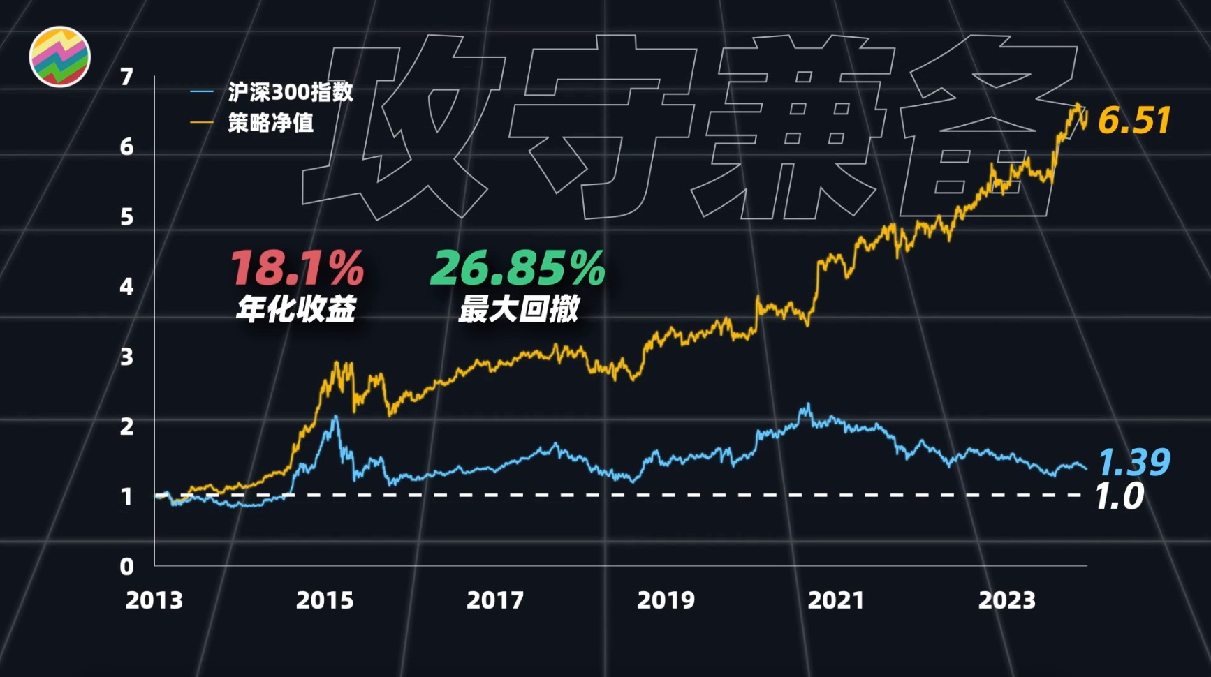 代表策略的橙色曲线从1元涨到6.51,年化收益18.1%,不仅跑赢了代表大盘的