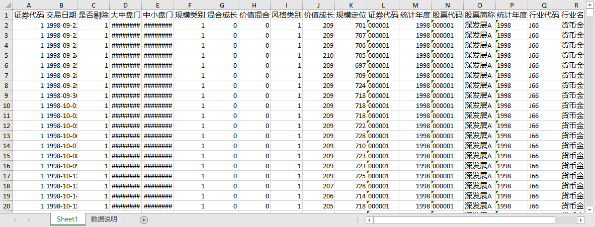 证券代码 交易日期 是否剔除北交所股票 大中盘门限值 中小盘门限值 规模类别 混合成长门限值 价值混合门限值 风格类别 价值成长定位 规模定位 证券代码c 统计年度 股票代码C 股票简称 统计年度C 行业代码 行业名称 股票代码