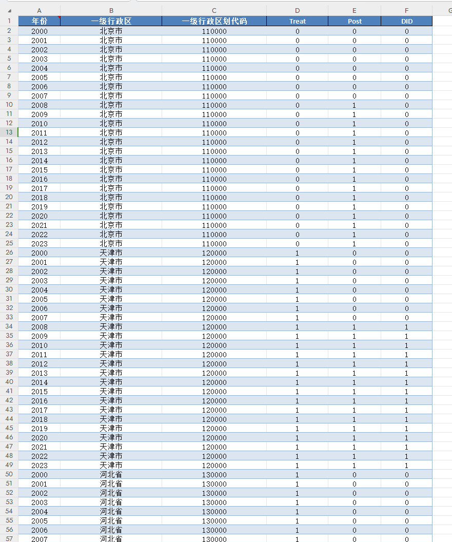 本数据集参考了彭水军和吴腊梅等(2024)的做法,使用“排污权交易政策试点”的政策虚拟变量(Treat×Post)表征。若样本省市为试点省市,则赋值为 1,否则为 0;Post为年份虚拟变量,2008 年及之后取 1,否则为 0。