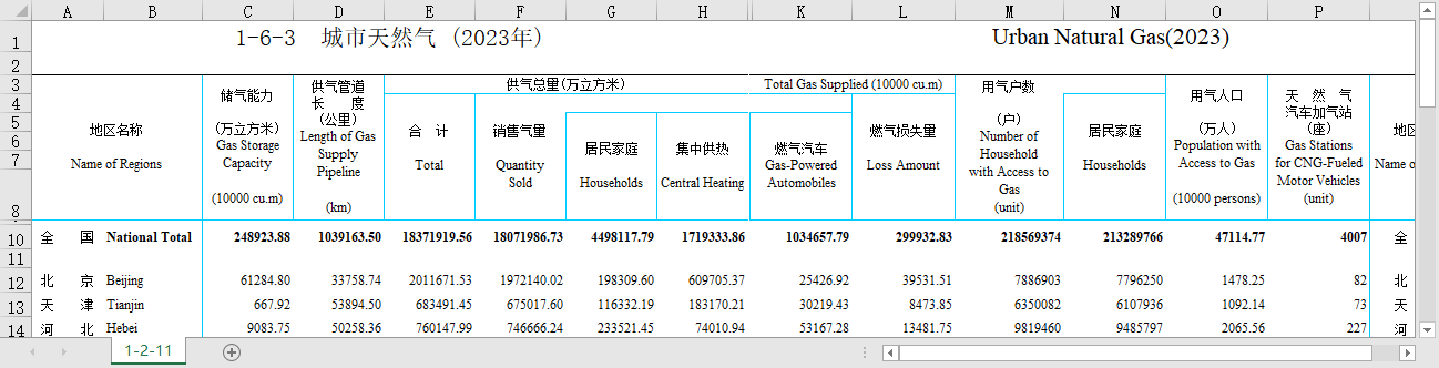 全国32个省份分省城市天然气(2006-2023)供气总量销售气量燃气汽车居民家庭集中供热用气户数等