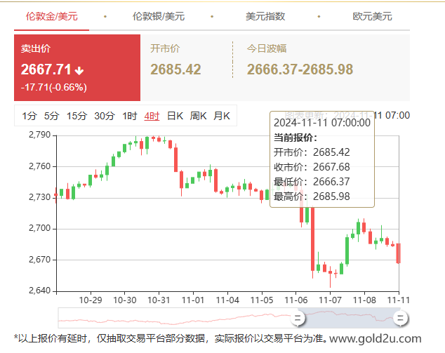 本周周一(11月11日):国际黄金微幅高开后,先行走弱,日内仍有承压走低的预期。除了30日及5日均线等压力外;