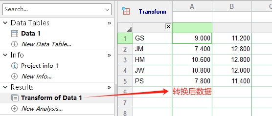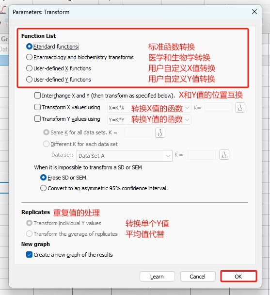 - Transform (转换):主要有4种转换方式(图4),分别是标准函数转换、药学和生物学转换、用户自定义的X值转换和Y值转换。标准函数转换包括X和Y值的位置互换,用户还可以自己选择X值和Y值转换的函数式。此外,对重复值的处理可以选择“转换单个Y值”或“平均值代替”的方法。转换后的数据,可在左侧Results (结果)部分查看(图5)。