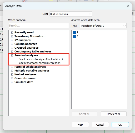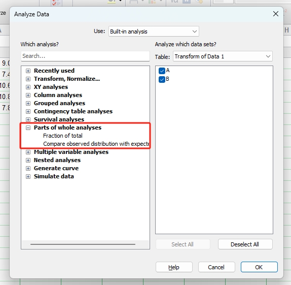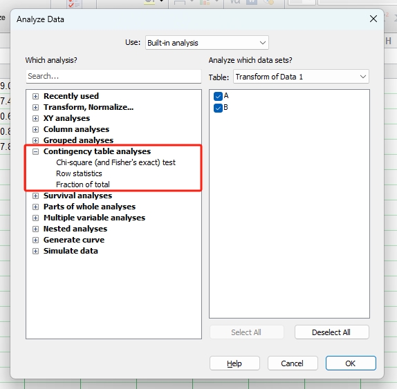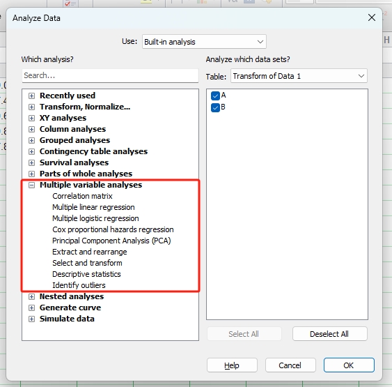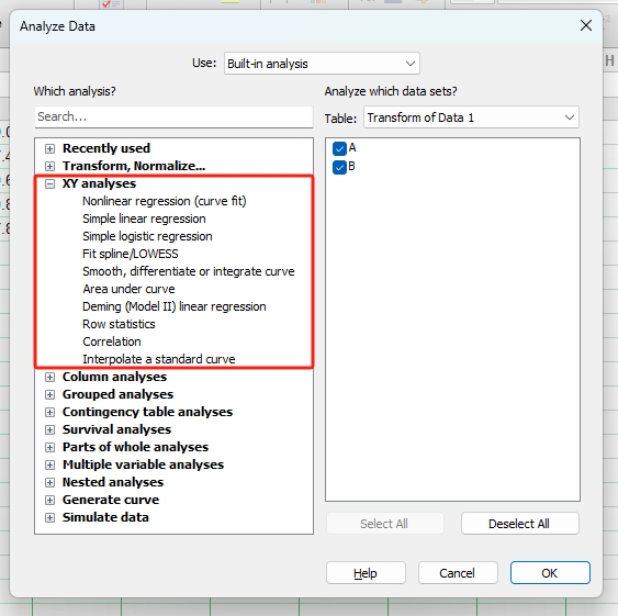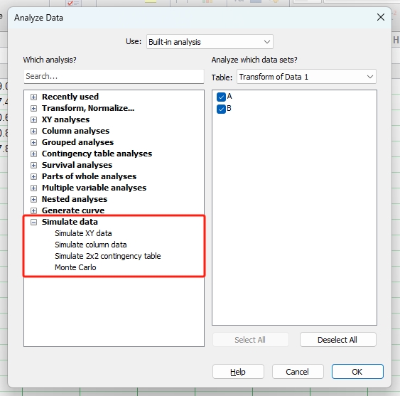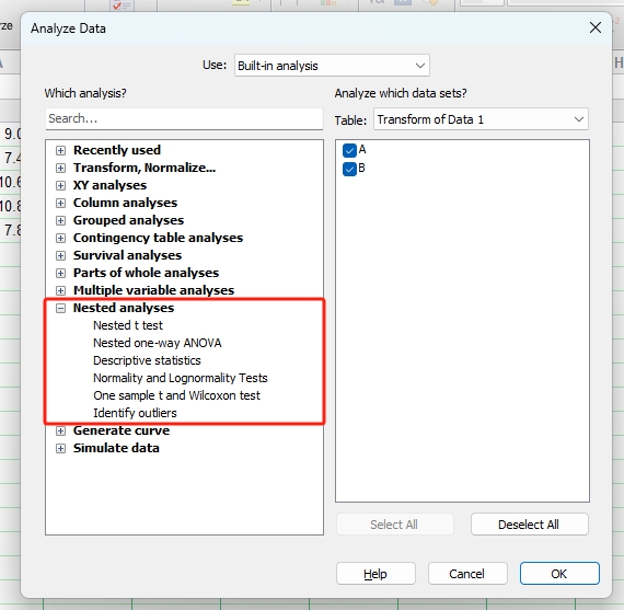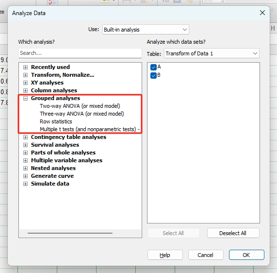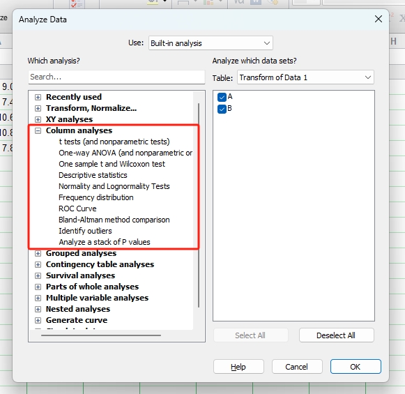 单击工具栏中的Analyze (分析)图标按钮(图1),即可进入Analyze Data (数据分析)窗口(图2)。左侧一栏为GraphPad软件内置的11类统计分析方法。11类统计分析方法中除了Transform, Normalize (转换,标准化)、Generate curve (生成曲线) 和Simulate data (模拟数据) 3类,其余8类统计分析方法与8种数据表相对应。此外,右侧一栏是要进行分析的数据集,勾选即可选中。