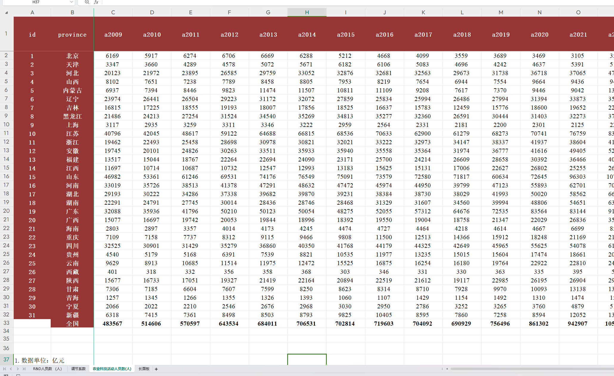 1、指标名称:各省农业科技活动人员数 单位:人