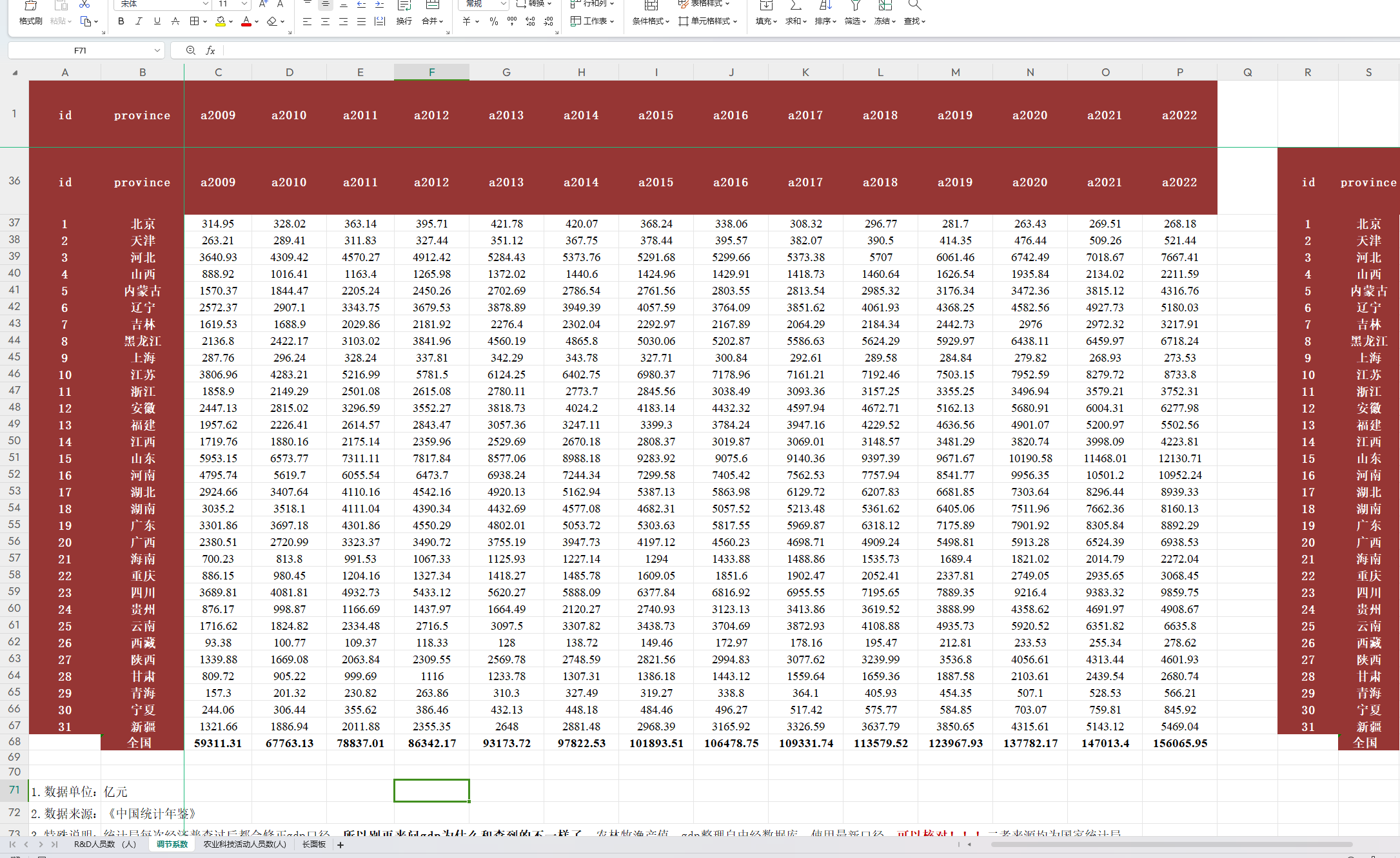 农业科技人员、农业科技活动经费等农科指标往往是获取不了的,唯一有可能获取的资料《全国农业科技统计资料汇编》全网无资源。因此目前学术界普遍的做法是构建调节系数测算。本数据参考陈振等(2018)的研究,农业科技活动人员数用R&D人员数乘以农林牧渔业总产值占地区生产总值的比重来衡量