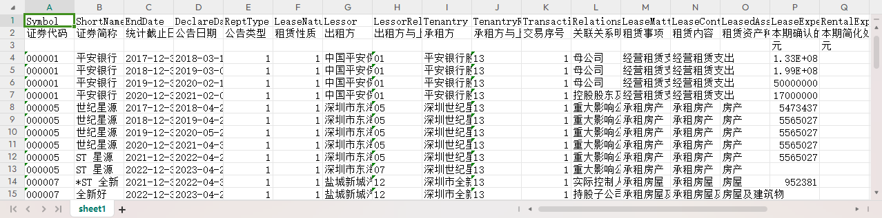 证券代码 证券简称 统计截止日期 公告日期 公告类型 租赁性质 出租方 出租方与上市公司关系分类 承租方 承租方与上市公司关系分类 交易序号 关联关系明细 租赁事项 租赁内容 租赁资产种类 本期确认的租赁费用 本期简化处理的短期租赁和低价值资产租赁的租金费用以及未纳入租赁负债计量的可变租赁付款额 支付的租金 增加的使用权资产 承担的租赁负债利息支出 币种 备注