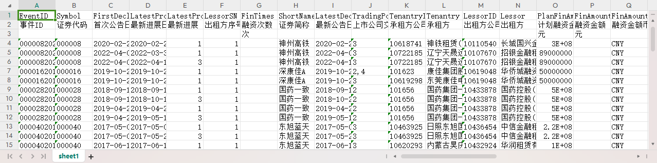 事件ID 证券代码 首次公告日期 最新进展日期 最新进展 出租方序号 融资次数 证券简称 最新公告日期 上市公司交易地位 承租方公司ID 承租方 出租方公司ID 出租方 计划融资金额 融资金额 融资金额币种 融资资金用途 留购价款 留购价款币种 提前终止违约金 租赁方式 租赁期限上限 租赁期限备注 租赁利率 租金支付方式 租金支付方式备注 租赁标的物 标的物类别 标的物全新公允价值 是否认定为低价值租赁 是否认定为短期租赁 标的物权属 标的物所在地 租赁是否发生变更 具体变更情况 是否涉及租赁担保 担保措施 是否涉及关联交易 是否构成重大资产重组