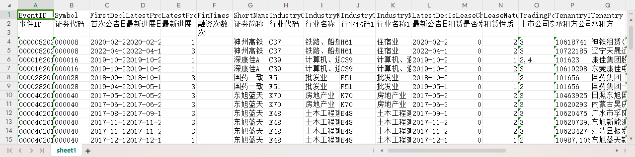 事件ID 证券代码 首次公告日期 最新进展日期 最新进展 融资次数 证券简称 行业代码 行业名称 行业代码1 行业名称1 最新公告日期 租赁是否发生变更 租赁性质 上市公司交易地位 承租方公司ID 承租方 出租方公司ID 出租方 出租方序号 计划融资金额 融资金额 融资金额币种 租赁方式 租赁期限上限 租赁利率 租金支付方式 标的物类别 是否涉及租赁担保 是否涉及关联交易 是否构成重大资产重组