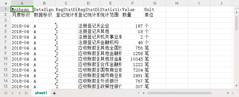 月度标识 数据标识 登记统计维度编码 登记统计维度 统计范围 数量 单位