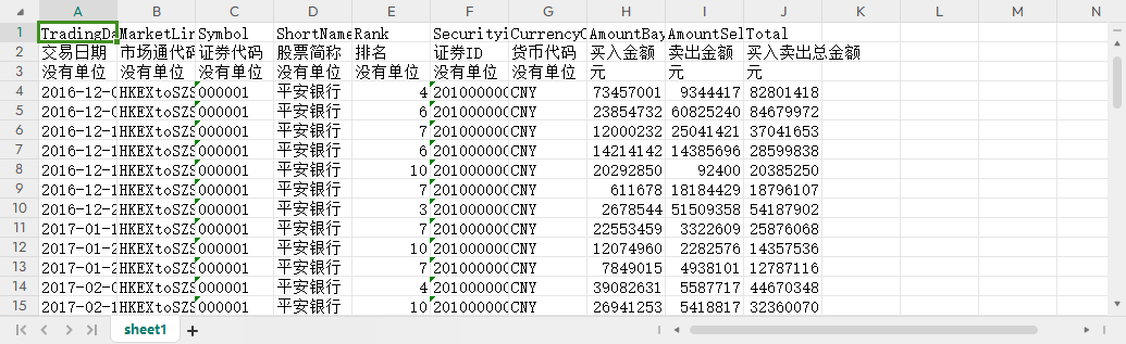 交易日期 市场通代码 证券代码 股票简称 排名 证券ID 货币代码 买入金额 卖出金额 买入卖出总金额