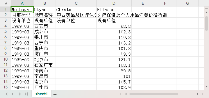 月度标识 城市名称 中西药品及医疗保健品零售价格指数 医疗保健及个人用品消费价格指数