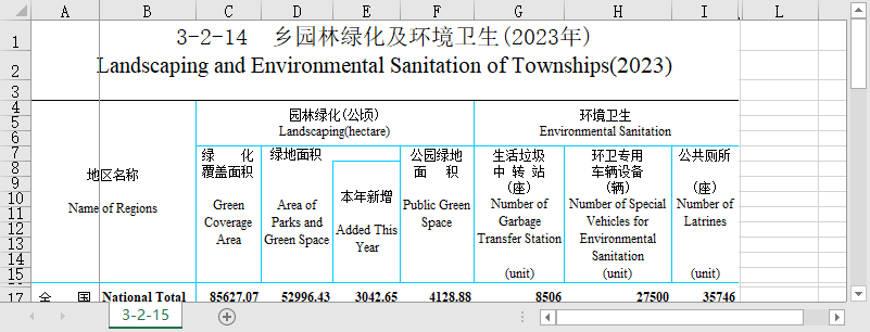 全国32个省份乡园林绿化及环境卫生(2007-2023)绿化覆盖公园绿地面积环卫专用车辆社保公共厕所个数等