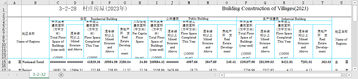 全国32个省份村庄房屋(2007-2023)乡村人均住宅建筑面积公共建筑房地产开发建筑混合结构等