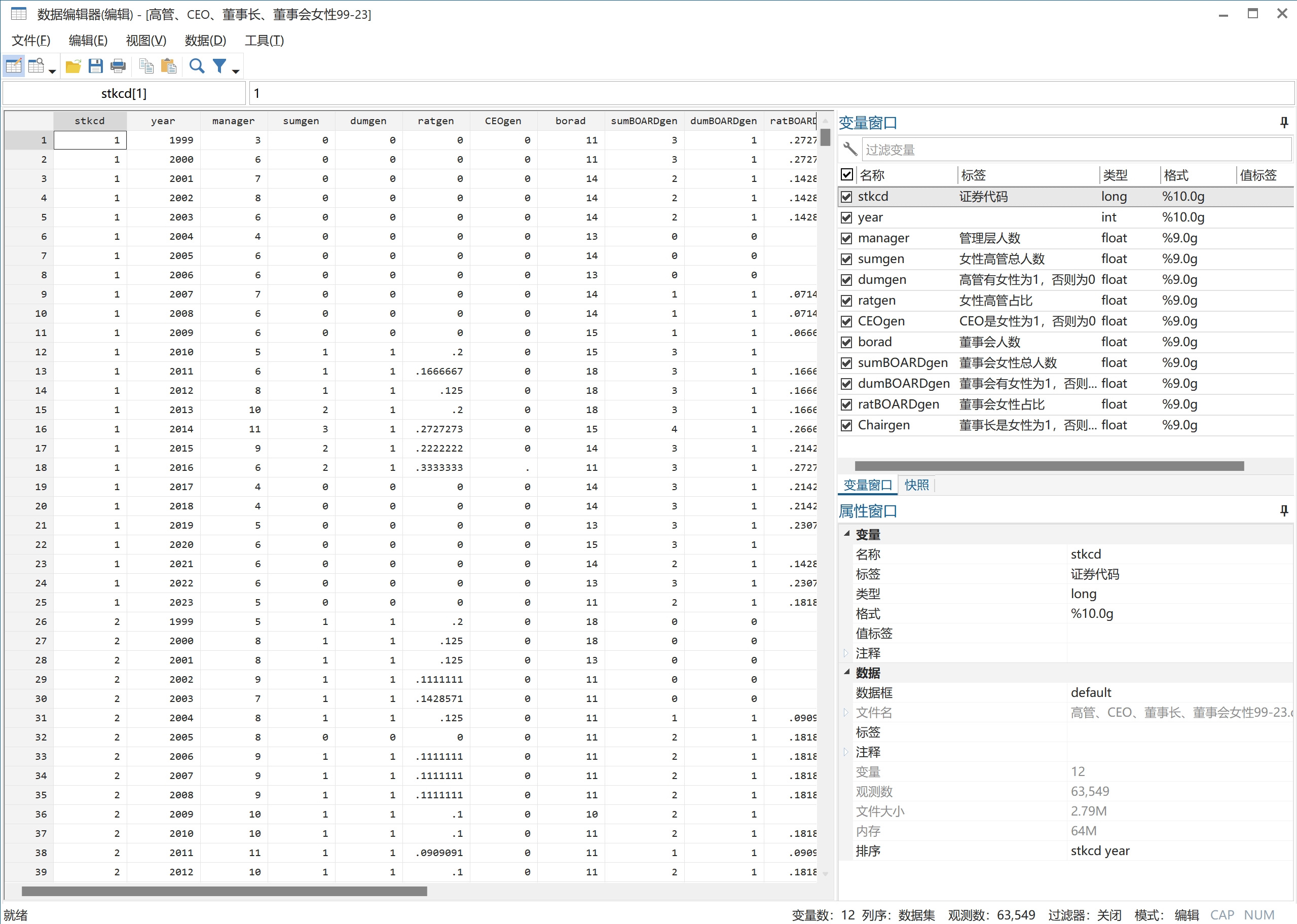 1. 女性高管:女性高管人数,是否有女性高管,女性高管占比;