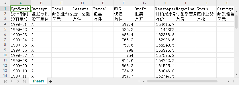 统计期间 数据标识 邮政业务总量 函件总数 包裹 快递 汇票 订销报纸累计数 订销杂志累计数 集邮业务 邮政储蓄期末余额