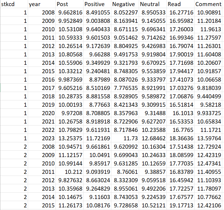 Post:上市公司当年度东方财富网股吧发帖数量之和加1并取自然对数