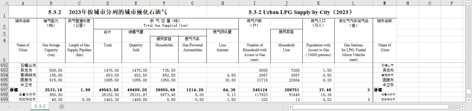 2002-2023年全国700多个地级市县级市按城市分列的城市液化石油气供气销售气量燃气损失量汽车加气站座数居民家庭用气人口等
