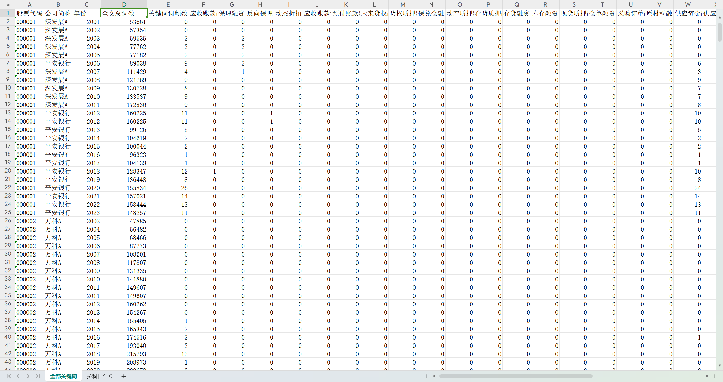 3. 资料范围资料范围:本数据集涵盖了从2001年至2023年间,共计5.5万个样本,涉及5355家上市公司的详细供应链金融数据。数据集中不仅包含了每家公司在不同年份的供应链金融活动情况,还附带了原始的关键词词频数据,供使用者进行复核和验证,以确保数据的真实性和准确性。具体指标包括但不限于证券代码、年份、应收类(如应收账款融资、保理融资等)、预付类(如预付账款融资、未来货权融资等)、存货类(如存货质押融资、库存融资等)以及综合类(如供应链金融、供应链融资等)的详细数据,同时还提供了供应链金融词频总数和经过对数化处理的供应链金融水平指标,以便进行更深入的分析和研究。
