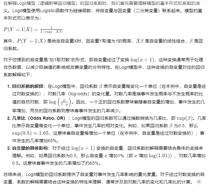 各位老师好,请问自变量是加1取对数的形式,因变量是0-1变量,采用logit模型,要怎么解释回归系数结果?谢谢大佬们!!!