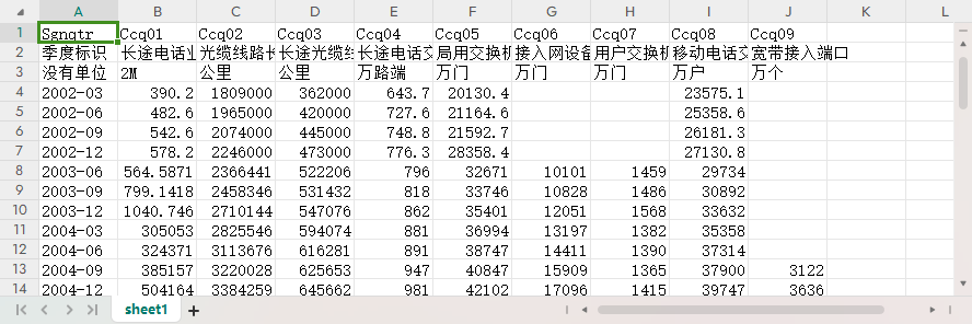 季度标识 长途电话业务电路 光缆线路长度 长途光缆线路长度 长途电话交换机容量 局用交换机容量 接入网设备容量 用户交换机容量 移动电话交换机容量 宽带接入端口