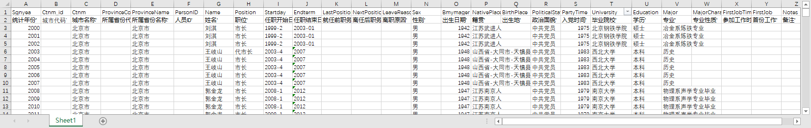 统计年份' 城市代码' 城市名称' 所属省份代码' 所属省份名称' 人员ID' 姓名' 职位' 任职开始日期' 任职结束日期' 就任前职务' 离任后职务' 离职原因' 性别' 出生日期' 籍贯' 出生地' 政治面貌' 入党时间' 毕业院校' 学历' 专业' 专业性质' 参加工作时间' 首份工作' 备注'
