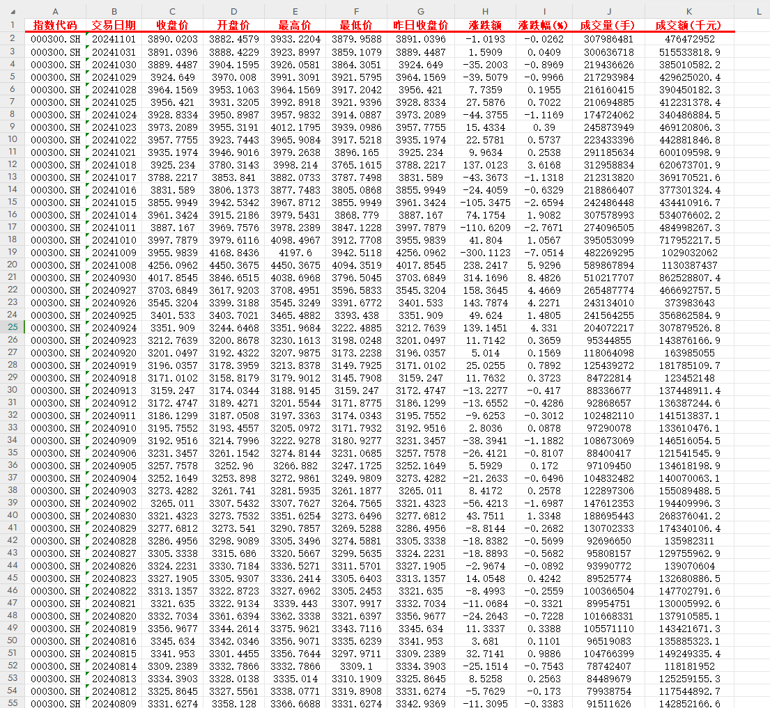 沪深300指数 历史交易数据 日线行情(综合版)