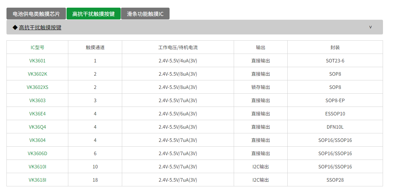 VK3604A 工作电压/待机电流:2.4V-5.5V/7μA(3V) 感应通道数:4 输出方式:直接/锁存输出
