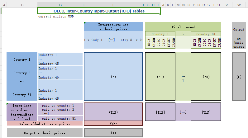 ICIO表通过按经济活动分类、按国家划分的方式,详实地描绘了生产、消费、投资以及货物和服务的国际贸易流动图景。数据覆盖全球范围且在一段时间内保持一致,使其非常适合于各种分析目的,包括但不限于全球经济链的研究、行业竞争力分析和政策制定依据等。