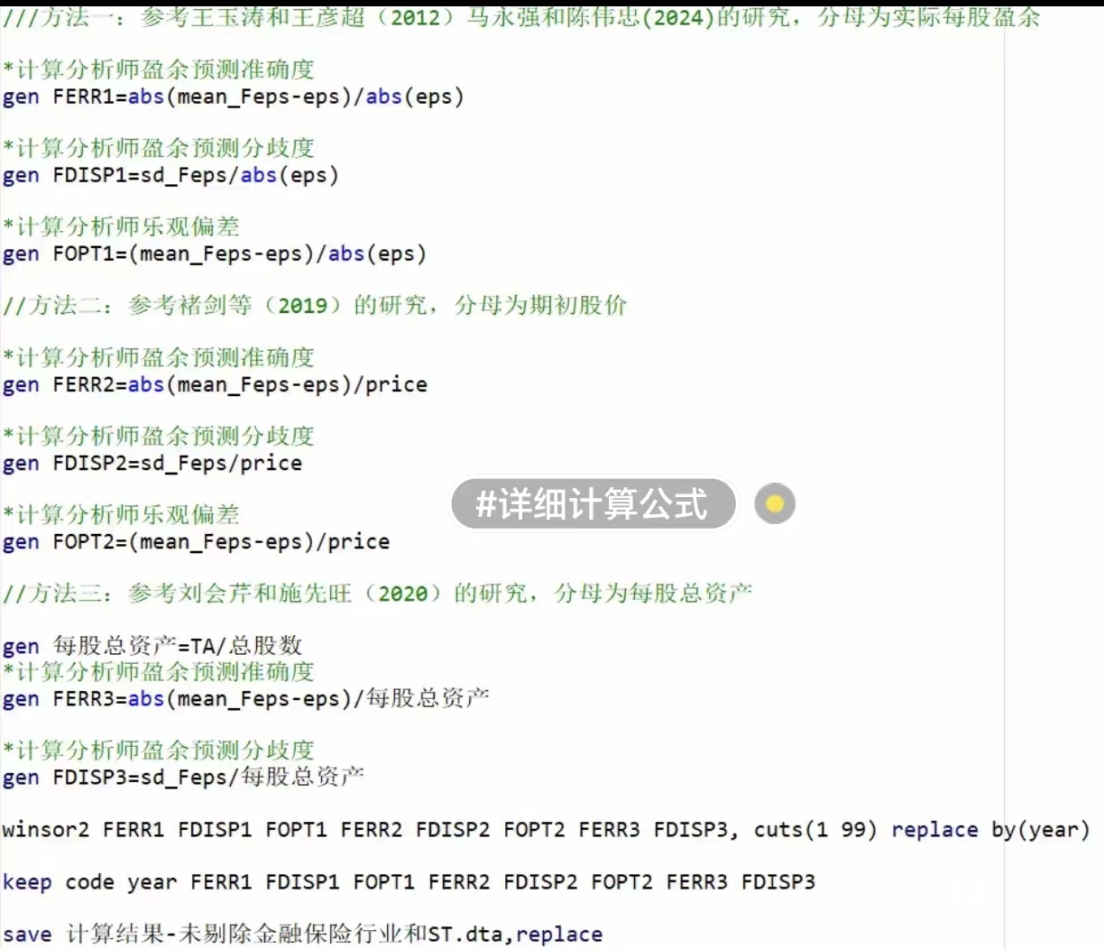 采用三种度量方法度量,包含分析师预测准确度、分歧度以及乐观偏差三种指标,详细计算公式可参见截图,已在1%和99%水平上缩尾