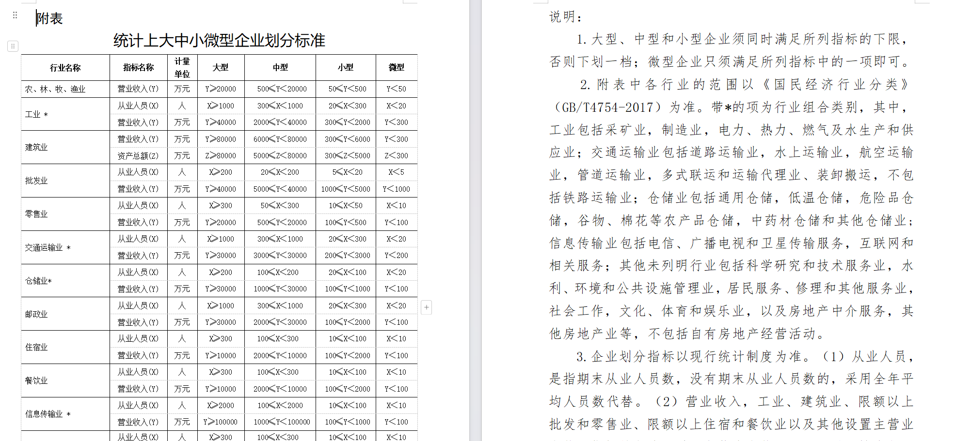 划分标准:《统计上大中小微型企业划分标准》,以资产总额、营业收入、从业人员数划分