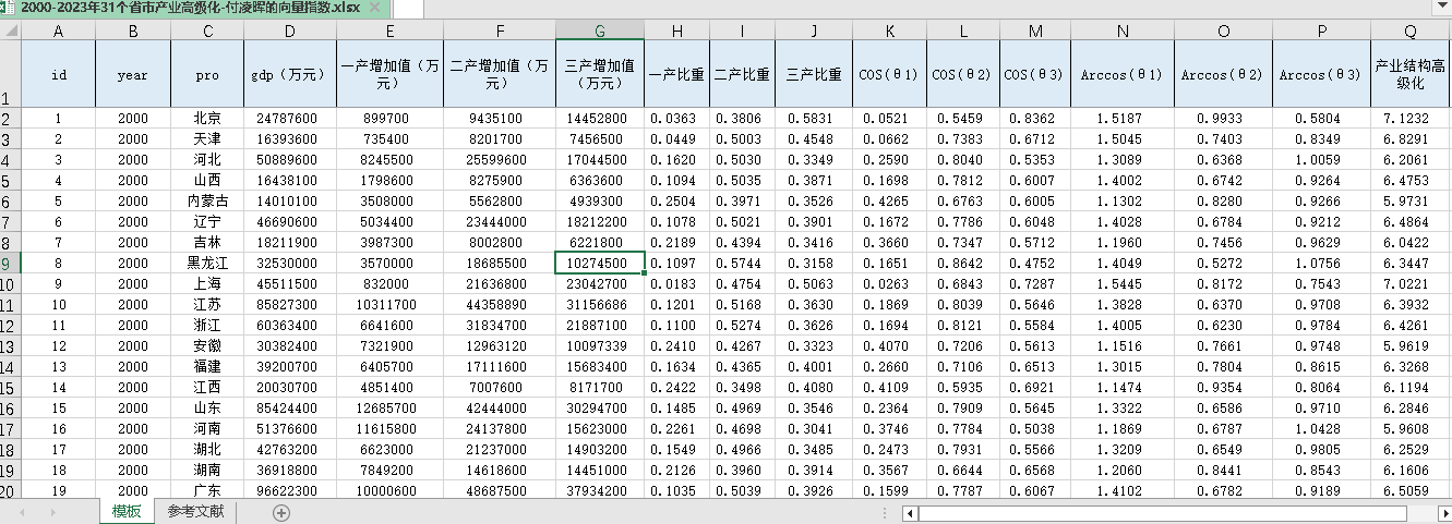 2000-2023年31个省市产业高级化-付凌晖的向量指数.xlsx