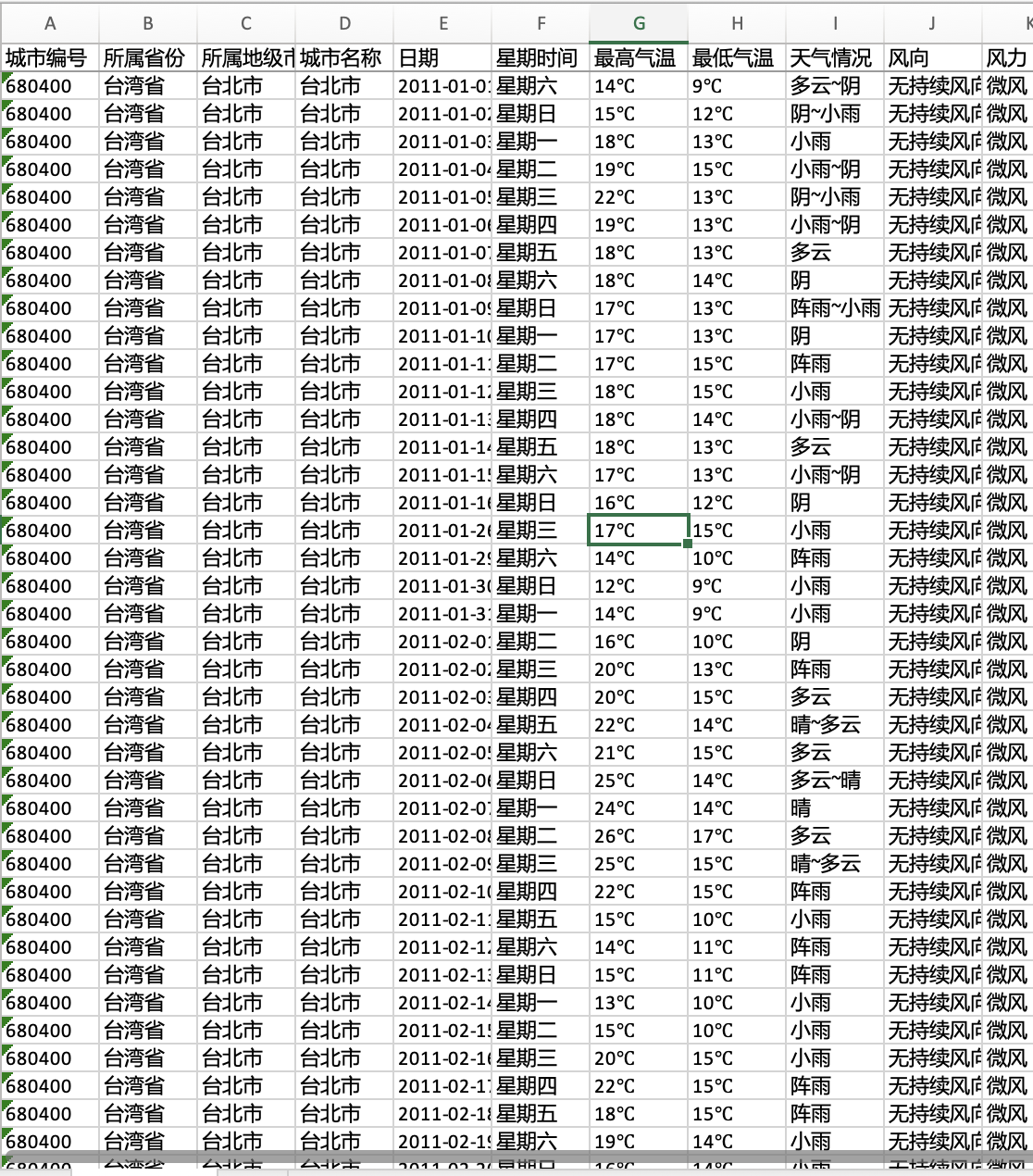 台湾省各地市城市气象日度气候数据2011-2022台湾城市最高最低气温风向风力天气情况