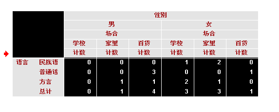 在SPSS:(分析——设定表)把性别和场合放在列,语言放在行,然后调出你要的统计量就可以了。