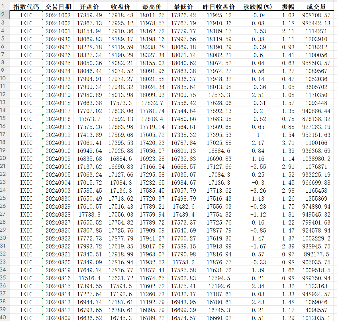 【最新2024】美股 纳斯达克 时序收盘价数据2008年11月-2024年10月
