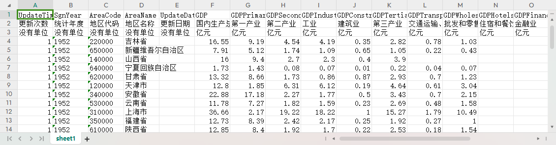 更新次数 统计年度 地区代码 地区名称 更新日期 国内生产总值 第一产业 第二产业 工业 建筑业 第三产业 交通运输、仓储和邮政业 批发和零售业 住宿和餐饮业 金融业 房地产业 其他服务业 第一产业占比(%) 第二产业占比(%) 第三产业占比(%) 人均国内生产总值